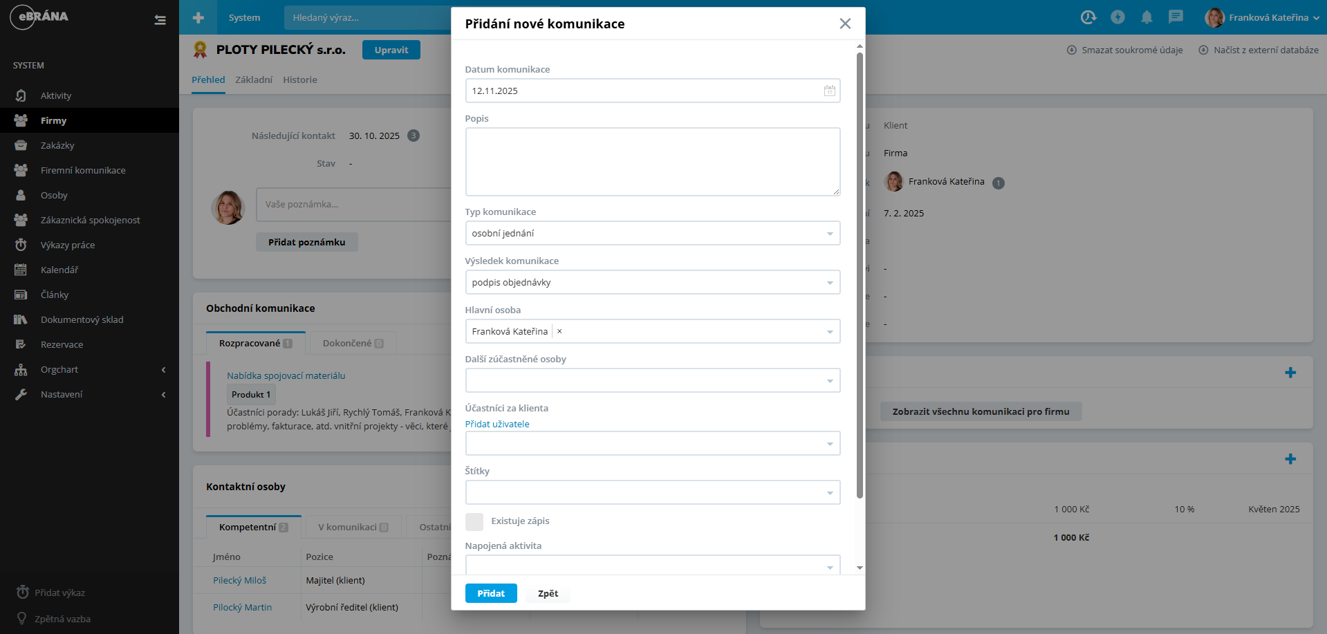 - Další zúčastněné osoby - pokud se jednání účastnil celý tým, lze jeho složení prostřednictvím tohoto pole zaevidovat