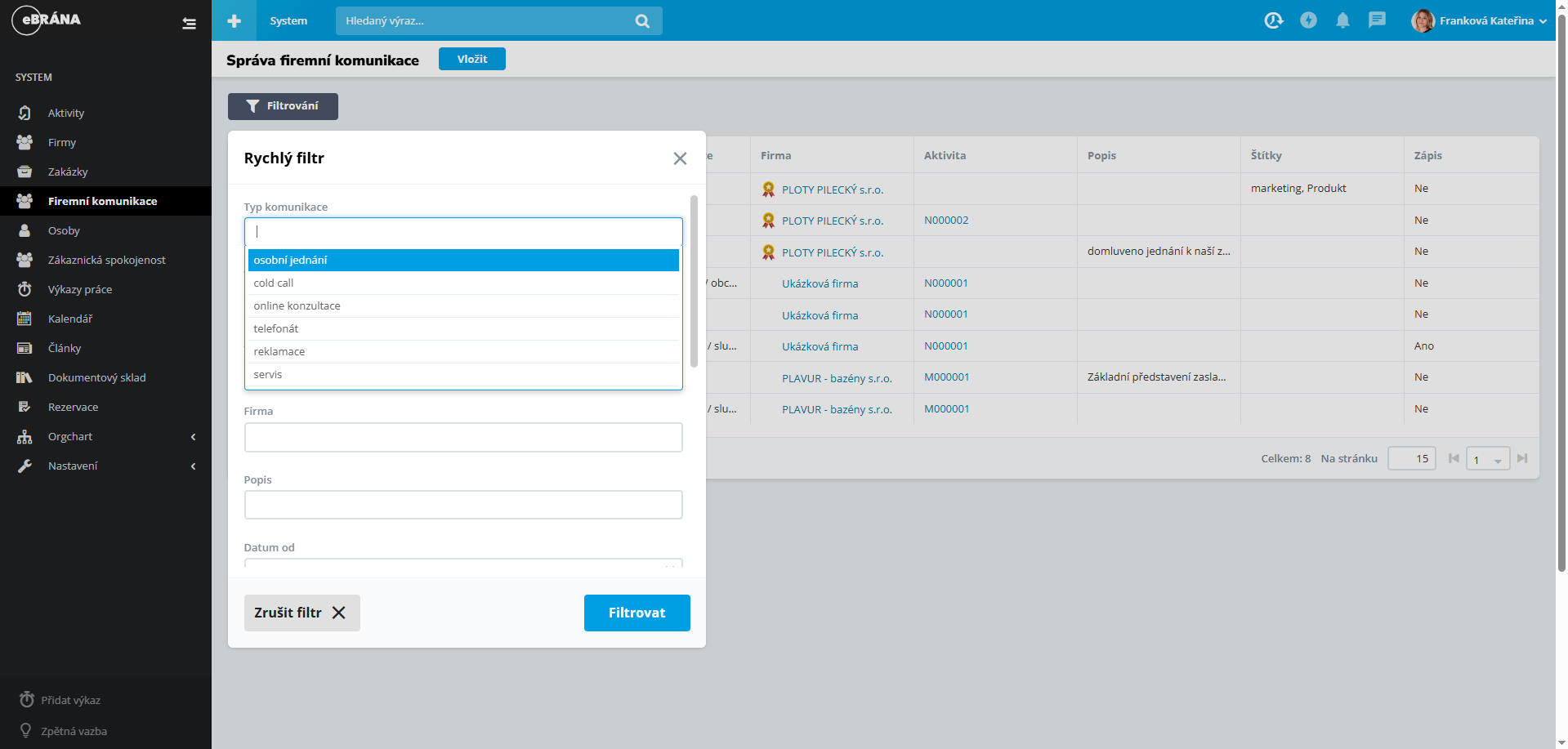 Dalším možným, mnohem více komplexním, přehledem je výpis v rámci samotného evidenčního modulu Firemní komunikace, kde se na data můžete koukat komplexně a zároveň využít i některou z možností filtrování dat dle konkrétního parametru (parametry lze samozřejmě i kombinovat) - např. typ komunikace, výsledek komunikace, datum od - do, obchodník atd.