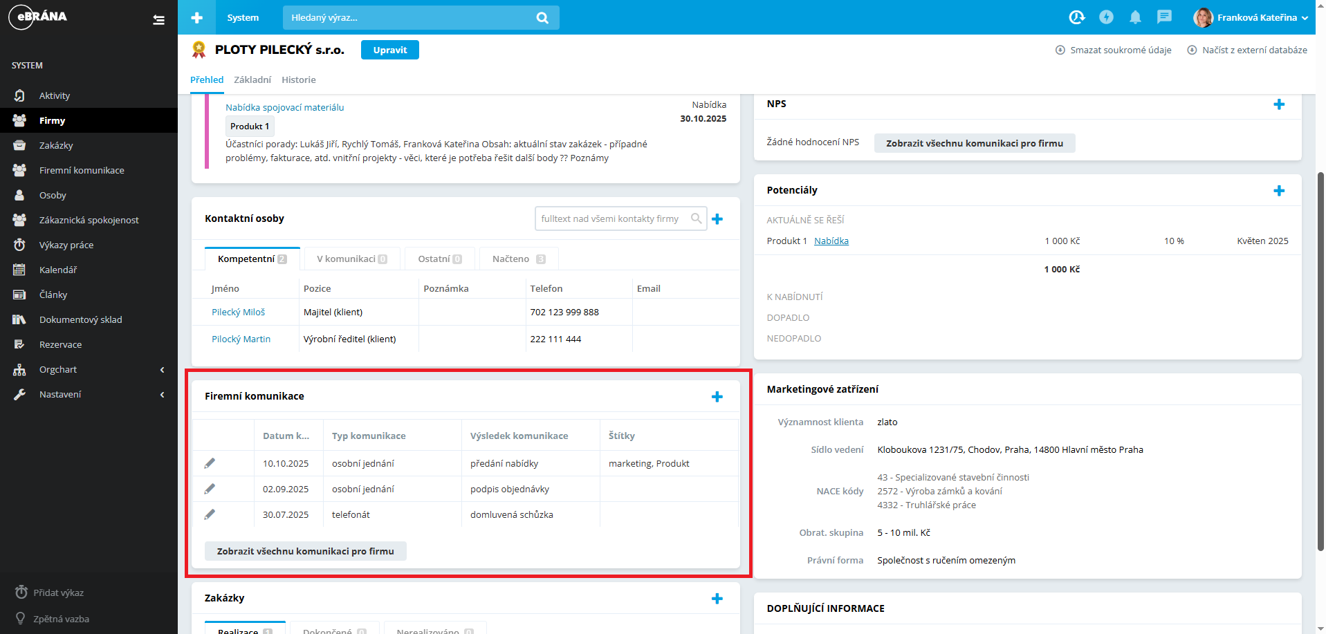 Modul Firemní komunikace nabízí jednoduchou strukturovanou evidenci obchodní komunikace s klienty, nad kterou lze navíc vytvářet globální pohledy, jenž vám pomohou odpovědět na některé klíčové obchodní otázky - Kolik prvo schůzek proběhlo za určité období? Kolik aktivních kompetentních kontaktů zvládne váš obchodní tým zrealizovat za měsíc? Kolik nabídek jste za určité období představili svým klientům? atd.